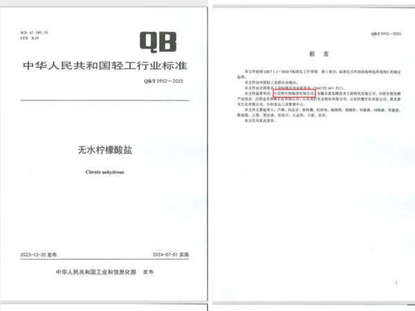 近日,大自然生物集團有限公司起草申報的《無水檸檬酸鹽》行業標準(QB/T5952-2023)經中國輕工業聯合會提出,歸口全國食品工業標準化技術委員會(SAC/TC64),由中華人民共和國工業和信息化部正式發布實施。
